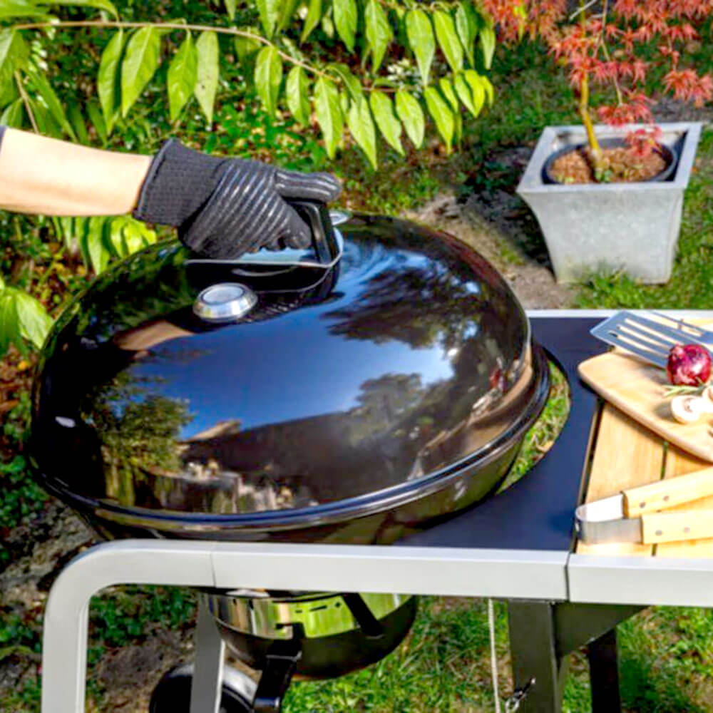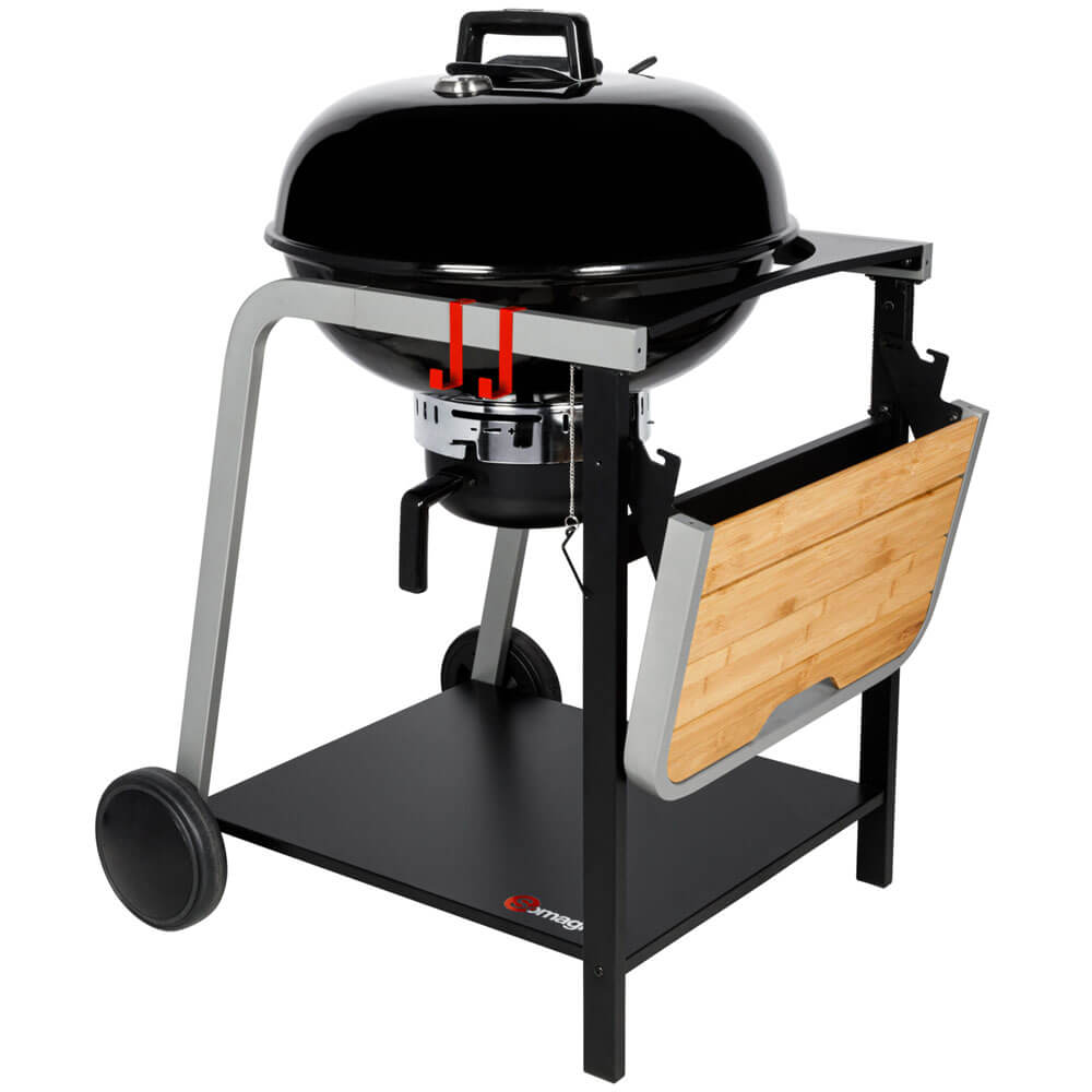 Barbecue à charbon de bois avec cuve en acier émaillé Ø57cm. Grille de cuisson en acier chromé Ø55cm + 2 verticales pour cuisson indirecte et couvercle de cuisson en acier émaillé avec système d’aération, cendrier et thermomètre. Sur chariot avec tablette latérale rabattable et plateforme de rangement