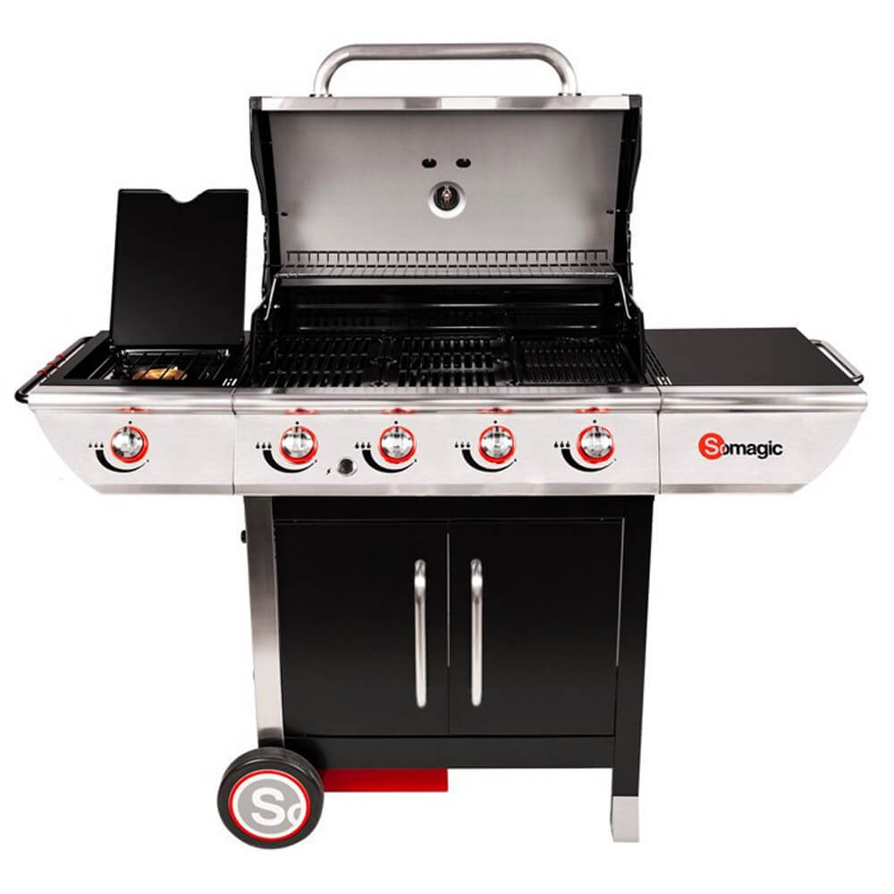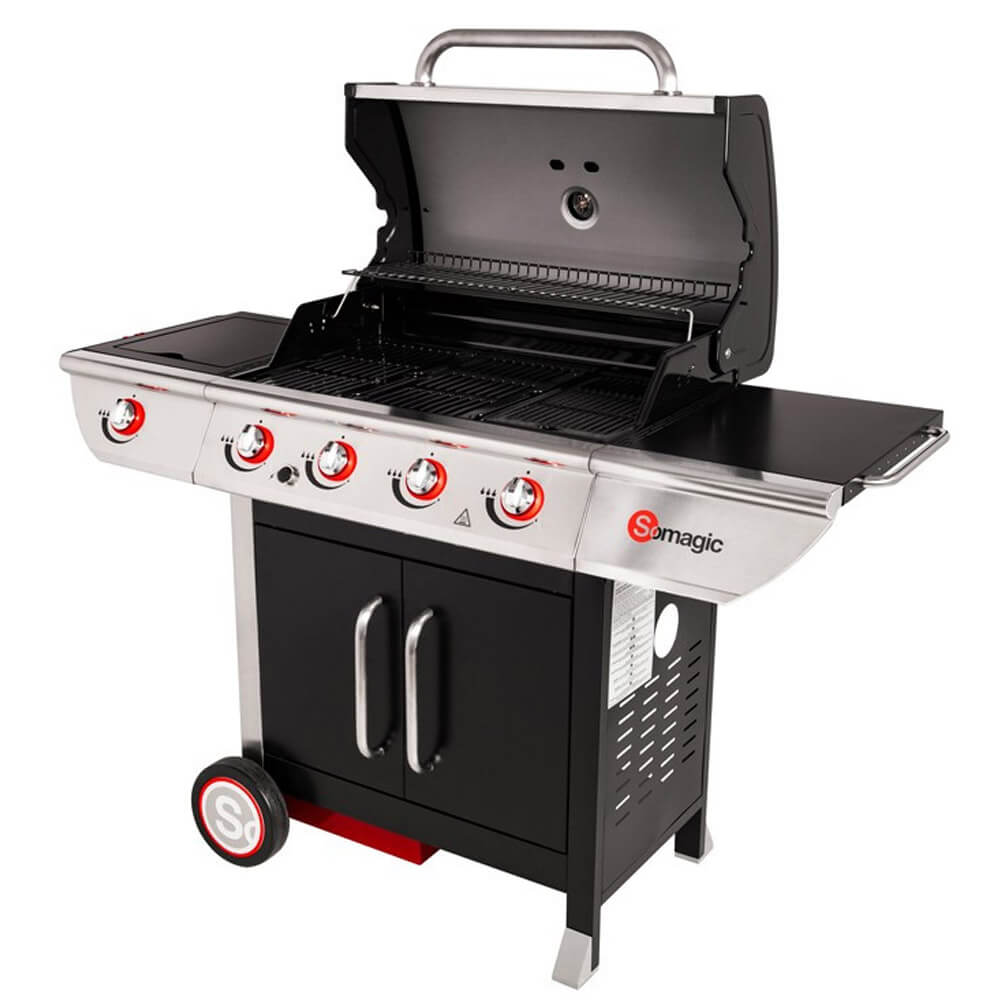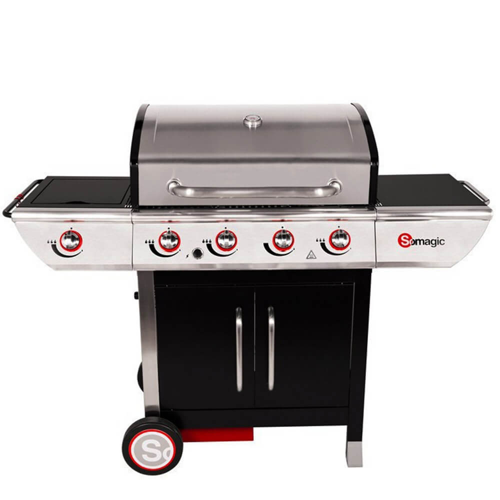 Barbecue à gaz en acier émaillé de Somagic , couvercle de cuisson et tableau de bord en acier inoxydable, sur chariot.