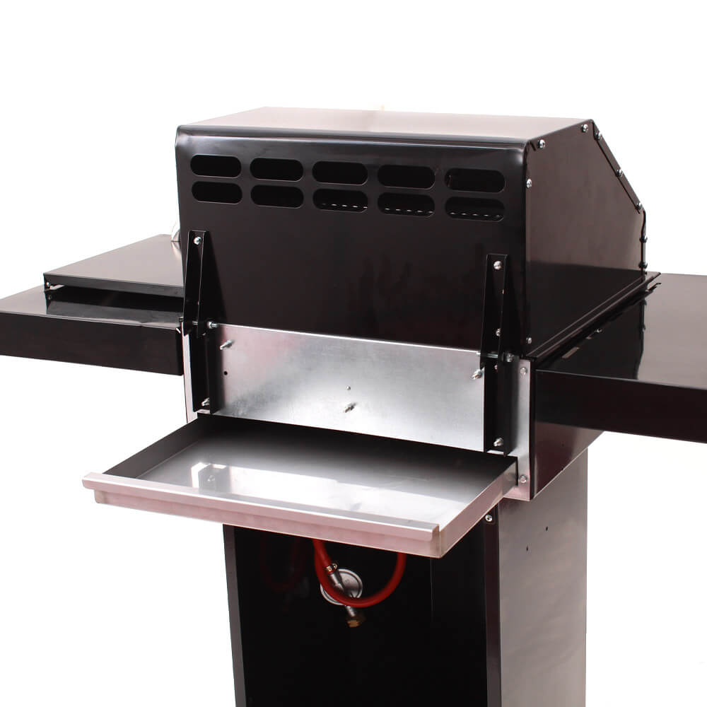 Matériaux robuste : Couvercle double paroi en inox avec thermomètre intégré ; chambre de combustion en inox ; panneau de commande, tablettes latérales