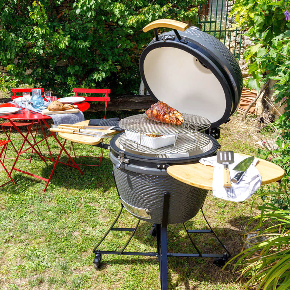 Découvrez notre modèle Kamado à charbon de bois, avec cuve en céramique, couvercle de cuisson, système d’aération, cendrier et thermomètre, 2 grilles inox , sur chariot avec tablettes latérales rabattables. Pour 12 personnes.