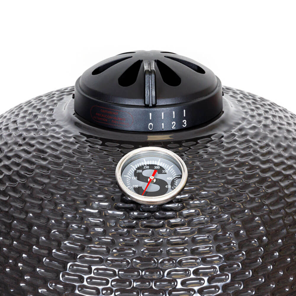 Barbecue Kamado avec cuve en céramique diamètre 61 cm, couvercle de cuisson, système d’aération, cendrier et thermomètre.