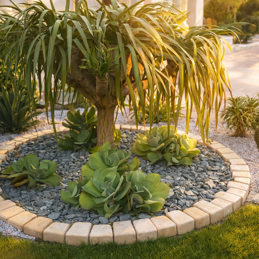 Pour un rendu professionnel, nous vous conseillons d’associer ces bordures à un paillage minéral (galets, ardoise) ou à un gazon dense. La texture rustique de la bordure crée un contraste saisissant avec la douceur du végétal, soulignant les formes de votre jardin avec caractère.