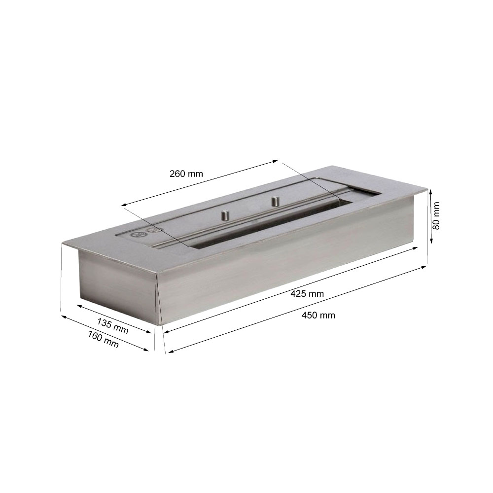 Brûleur encastrable bioéthanol 45cm – en acier inoxydable – une durée de consommation d’environ 4 heures – dimensions de 45x16x7cm – capacité du réservoir 2,5 litres