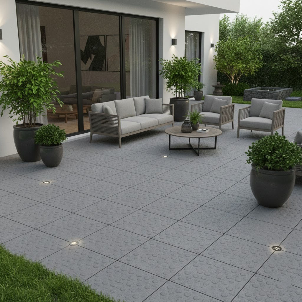 Apportez modernité et sécurité à vos espaces extérieurs avec le dallage « TOMPON » 30×30. Reconnaissable à sa surface en relief composée de motifs circulaires réguliers, ce dallage offre à la fois un aspect graphique contemporain et une adhérence renforcée, idéale pour les zones humides comme les plages de piscine, terrasses ou allées.