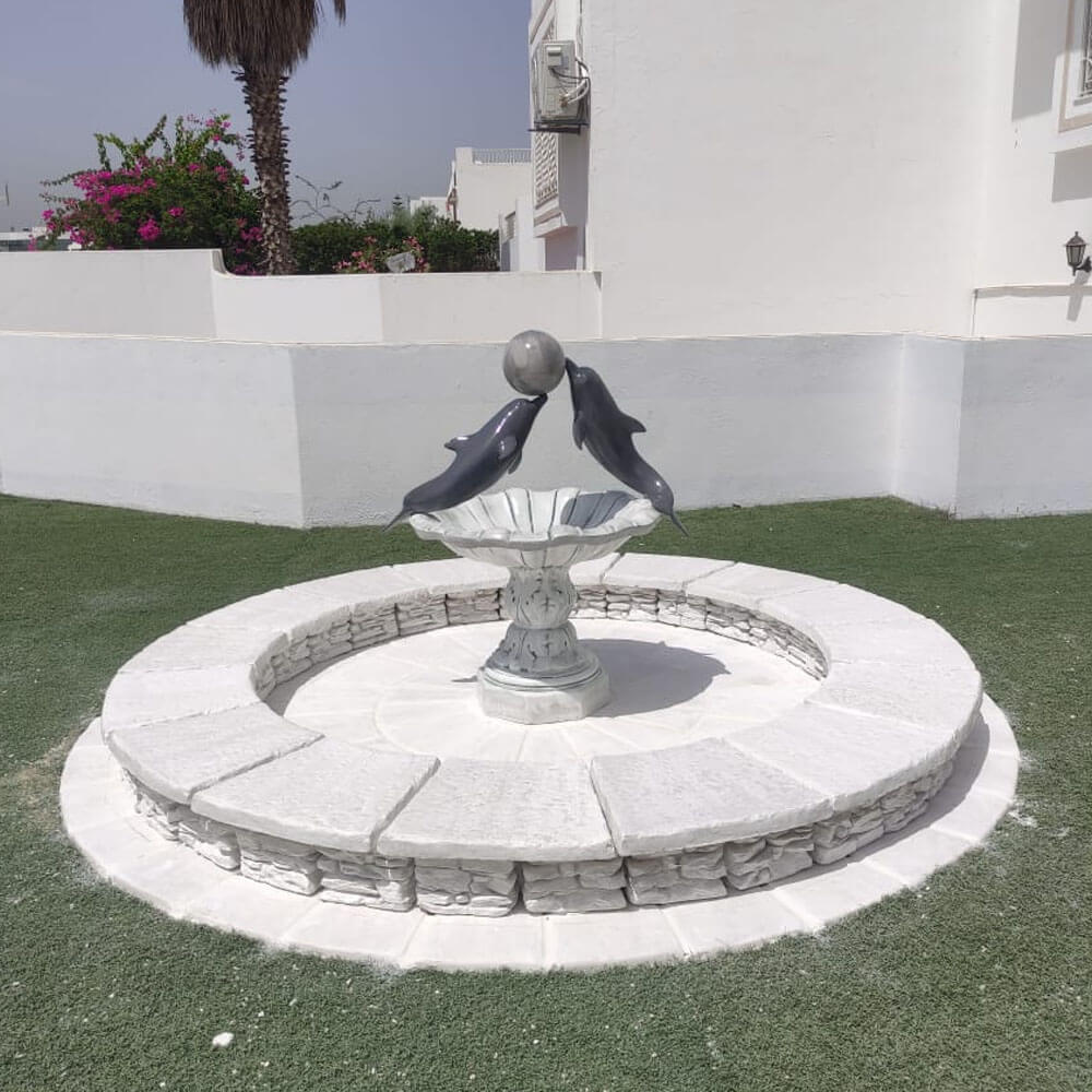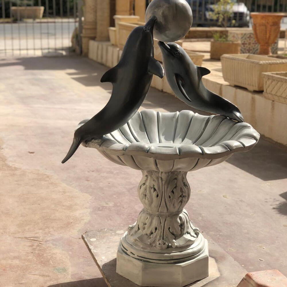 Cette fontaine centrale en resine ornée de deux dauphins majestueux, pour apporter une touche d’élégance et de raffinement à votre espace, 100% tunisien et finition à la main, fontaine destiné à l’extérieur comme à l’intérieur.