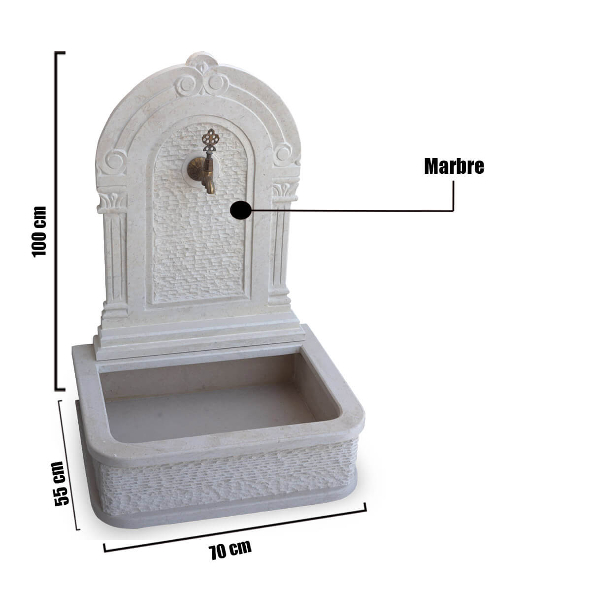 fontaine murale exterieur pour jardin en marbre , dimension : 70x55x100 cm. Cette fontaine sera parfaite pour créer un point d’eau dans votre extérieur.
