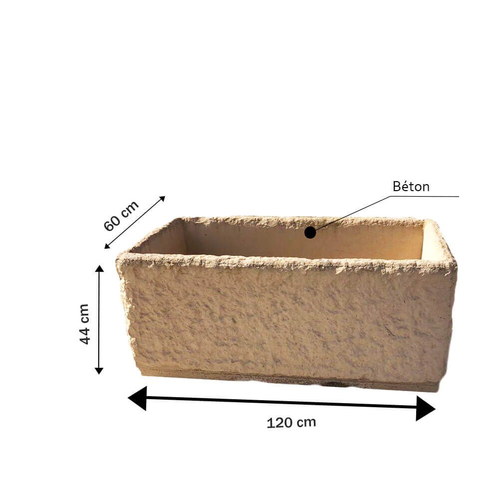 Décorez votre extérieur , jardin avec se grand Bac à fleurs en béton, le modèle BF006 ajoutera un aspect naturel à tout espace extérieur et intérieur. Dim : 120x60x44cm et poids >120Kg