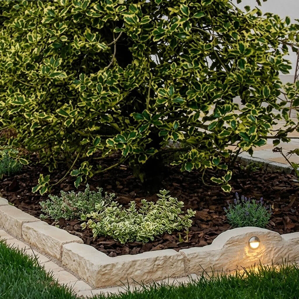 Aspect Pierre Authentique : Une texture travaillée et une couleur sable naturelle qui s’intègrent parfaitement dans les jardins méditerranéens et contemporains.