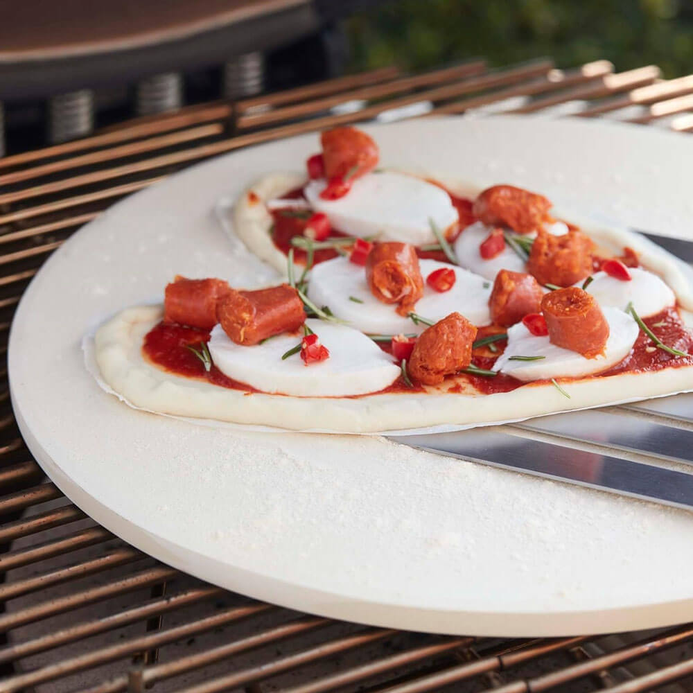 Comment cela fonctionne-t-il ? Placez la pierre à pizza sur un barbecue préchauffé (250 à 300 °C) et laissez-la chauffer pendant 10 minutes. Saupoudrez la pierre d’une poignée de farine ou de fleur de farine et faites glisser avec précaution la pizza sur le dessus. Ensuite, faites cuire la pizza sous couvercle fermé. La chaleur se répartit uniformément à travers la pierre, ce qui permet de cuire uniformément la pâte de la pizza. De cette façon, vous obtenez un belle pâte croustillante.