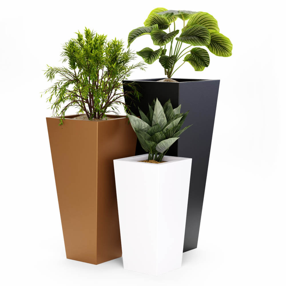 Pot pyramidal haut en résine modèle Cono, trouve toujours sa dimension dans n’importe quel espace, domestique ou commercial. Grâce à son design linéaire et à ses couleurs vives chaque ambiance devient chaleureux, animé et original