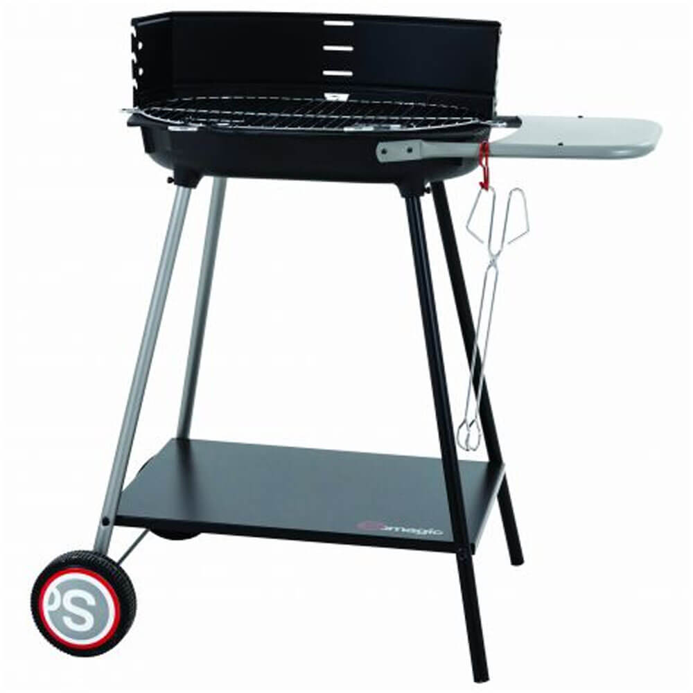 Barbecue à charbon de bois Myconos – fabriqué avec une cuve en fonte (52 x 37,5 cm) – grille de cuisson en acier chromé est de dimensions 50,5 x 33 cm – Chariot stable et robuste avec plateforme de rangement.